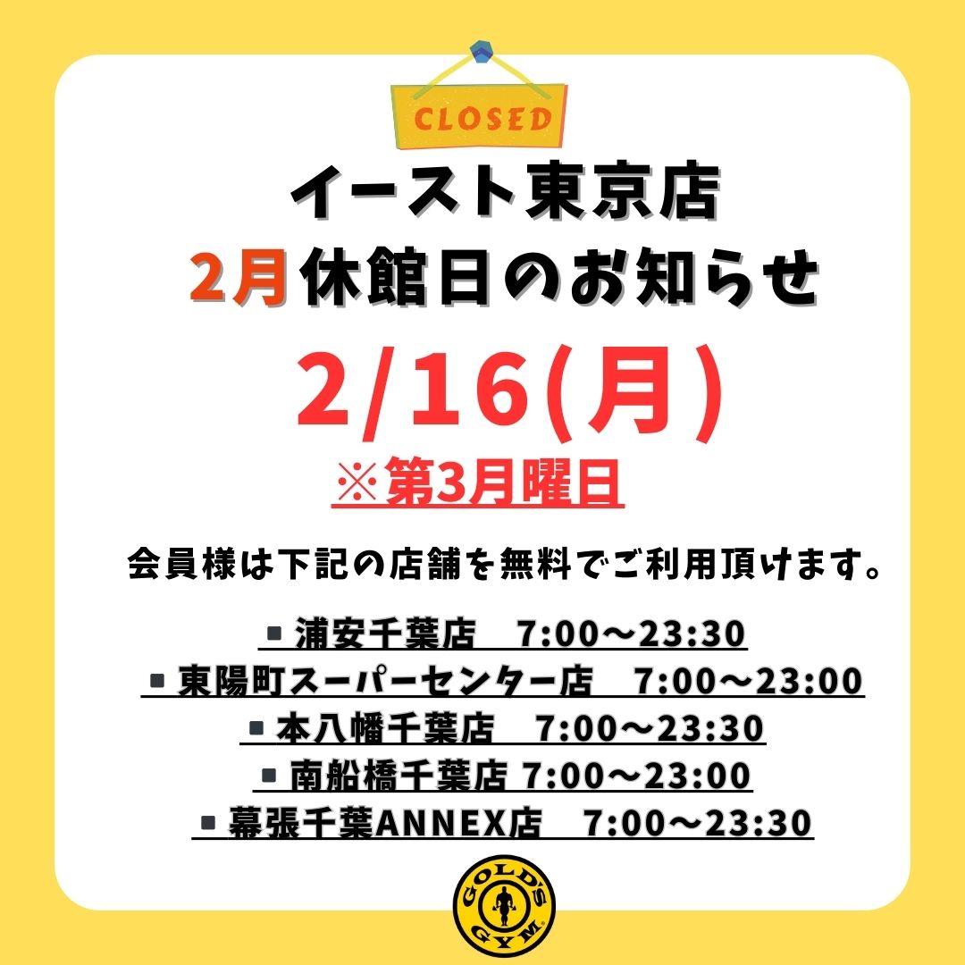 ※休館日は浦安店・東陽町店・行徳アスレチックセンター店・本八幡店・南船橋店のご利用が可能です。