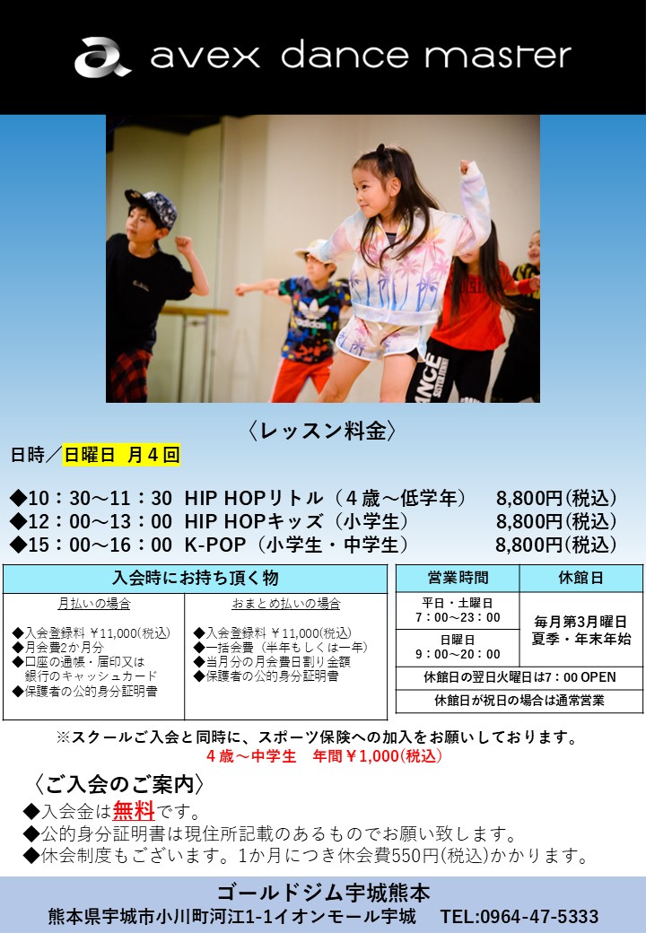 | 月会費 | HIPHOPリトル(4歳~低学年) 8,800円(税込) HIPHOPキッズ(小学生) 8,800円(税込) K-POP小学生~高校生. 8,800円(税込) ※年間のスポーツ保険料 4歳~中学生 1,000円(税込) |